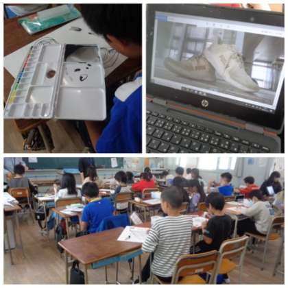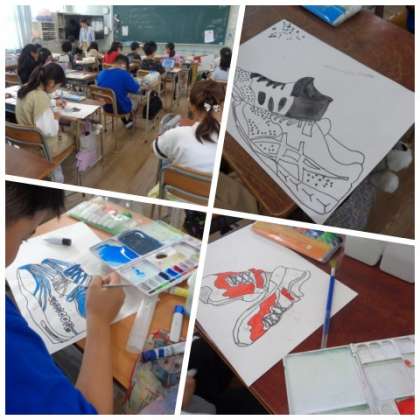 5年生が図工の学習で、線画に取り組んでいました。細部までしっかりと観察しながら、線で表現したスニーカーに色付けをしていました。色付けは、絵の具の濃度に注意を払いながら進めていました。