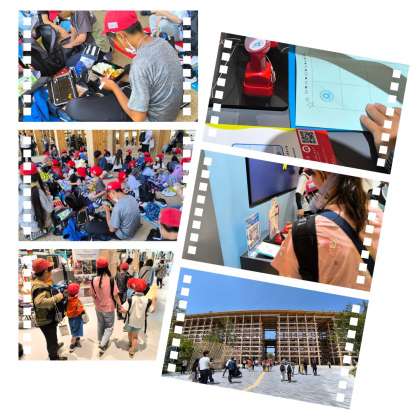 到着後、いよいよ活動の開始です。午前の活動は前述の通り1年生と6年生がペアで活動します。目的地の「コモンズA」に到着後は6年生のエスコートで見学をしたり、各ブースにあるスタンプを押したりしていました。