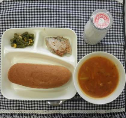 1年生の子どもたちが入学して約2か月がたちました。給食の準備もかなり慣れ、上手に配膳ができるようになっています。この日の給食では、ミネストローネに入っている「アルファベット型の小さなマカロニ」に大興奮でした。