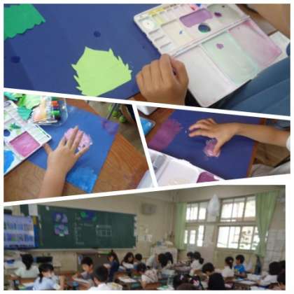 3年生が図工でアジサイの花の絵を描いていました。薄目に溶いた絵の具を指で画用紙にこすりつけながら、アジサイの花を表現していました。指を使って描くことで生じる絵の具のこすれた感じで、花びらの雰囲気をうまく表現していました。