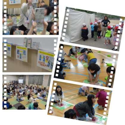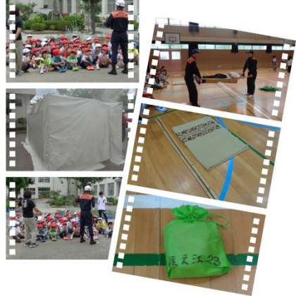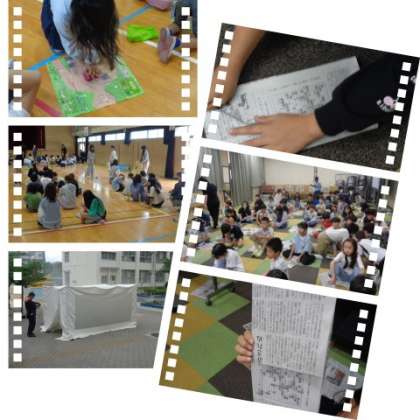 防災プログラムの内容は、1・2年生が運動場に建てたテントを使っての「けむり体験」と教室での防災のDVDの干渉。3・4年生が多目的室で行った「新聞スリッパ」の制作と債2音楽室で防災に関するクイズにチャレンジしました。5・6年生は講堂で「救命練習」と「簡易担架の作成」に取り組みました。