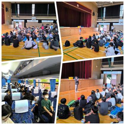 今日、明日の2日間、6年生が信楽・鳥羽方面に修学旅行に行きます。まずは、出発式と出発の様子です。朝早くの集合でしたが、みんな元気いっぱいでした。お天気にも恵まれて、よい旅行になりそうです。それでは、いってきま〜す!