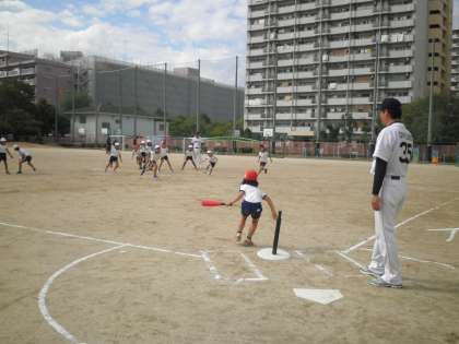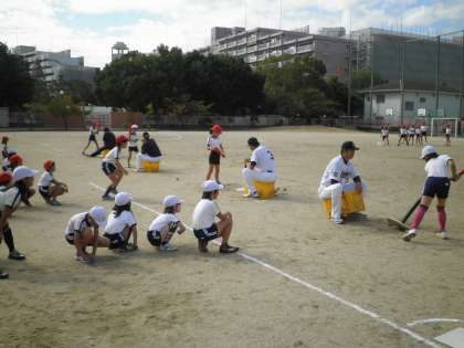 3年生は、オリックスバッファローズの選手の方々に来ていただいて、「Tボール教室」を行いました。プロの選手に教えていただくことに子どもたちは、大喜びで、広い運動場に、子どもたちの歓声が響き、とても楽しい時間となりました。