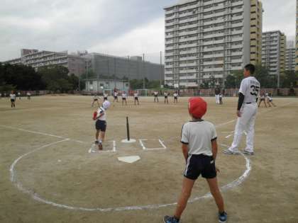 2・3年生に引き続き、4年生でもTボール教室をしました。オリックスバッファローズからは、4名の方々が来て、ご指導していただきました。元プロ野球選手の方やアテネオリンピックで金メダルをとった方に指導していただいたので、子どもたちは、大興奮でした。