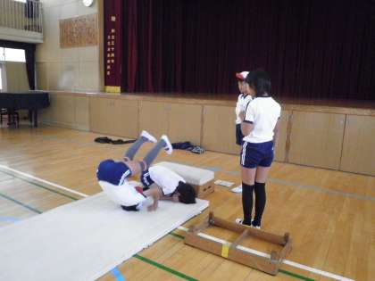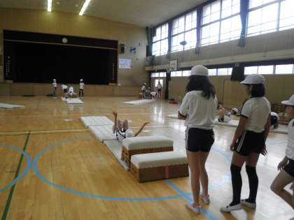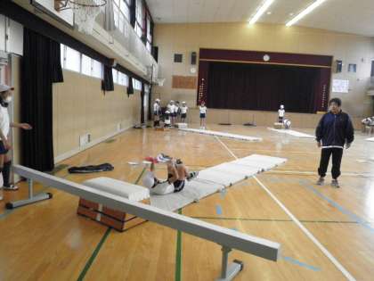 6年生は、マット運動で飛び込み前転ををしています。はじめは、こわごわやっていた子どもたちも先生の助言にどんどん上達し、できるようになっていき、子どもたちの笑顔に自信が見られるようになりました。できた喜びを感じた子どもがたくさんいました。