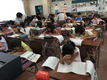 南港桜では夏休みに学習サポート教室を行っています。たくさんの子どもたちが参加して一生懸命学習しています。