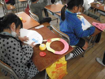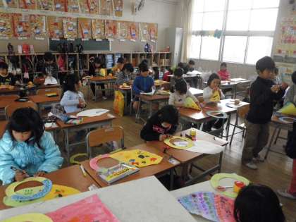 1年生は、図工でぼうし作りをしています。かわいい絵をかいてとても素敵な帽子ができました。
