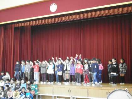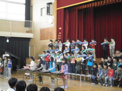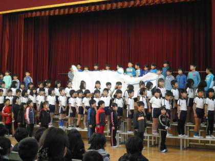 2時間目は、1・2年生の学習発表会でした。1年生は国語で学習したことをもとに「くじらぐも」を音読やダンス・歌を交えて大変楽しい劇になりました。2年生は、合奏やボディーパーカッションと最後は2年生全員での群読はとても迫力がありました。