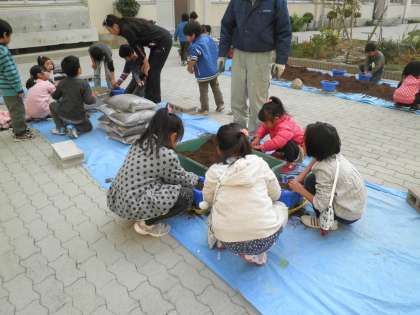 1年生は、咲き終わった朝顔の植木鉢にチューリップの球根を植えました。「私の球根は赤い花が咲くんだよ。」とうれしそうに教えてくれました。春になるときっときれいな花を咲かせてくれるでしょう。楽しみですね。
