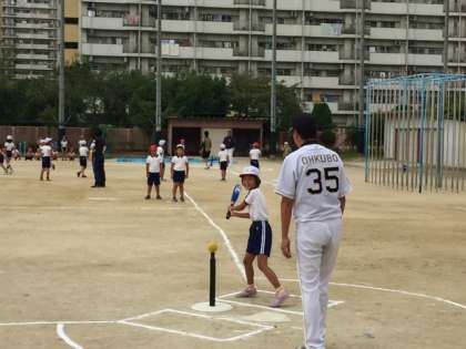 3、4年生はオリックスバファローズの方々にティーボールを教えていただきました。
