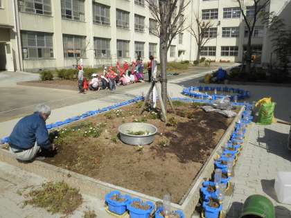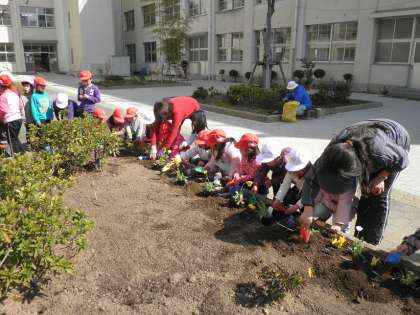 1年生は管理作業員さんと一緒に、花の苗を花壇に植えました。