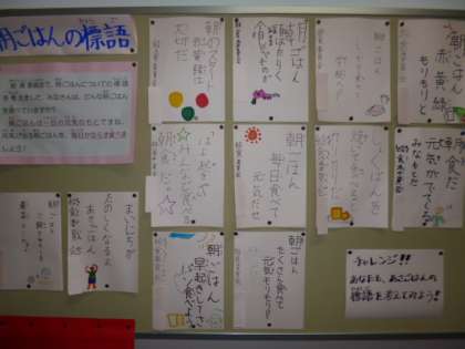 また、給食室前の掲示板には、毎月さまざまな食に関する掲示を行っています。6月は給食委員会の児童が書いた「朝ごはんの標語」をはっています。「食パンを 焼いて食べると カリカリだ」など、おいしい朝ごはんをイメージした標語です。