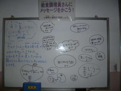 本校の給食室前には、児童が給食室へのメッセージを書くホワイトボードがあり、毎日給食の感想などを自由に書いています。ときどき給食室からのメッセージも書かれていて、コミュニケーションツールとして役立っています。