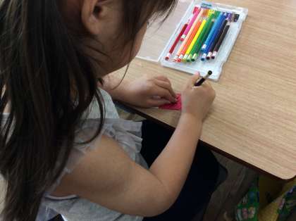 「こいのぼり」の折り紙に挑戦!カメラの映像をテレビに映し、先生の折り方を真似して、こいのぼりを折りました。「You Yubeだ!」と喜ぶ子どもたち。上手にていねいに折ることができました。最後はネームペンと色鉛筆を使って、オリジナルのこいのぼりに仕上げました。できあがったものをテレビ画面に映して、みんなで見せ合いました。子どもたちの笑顔があちこちであふれる時間になりました。