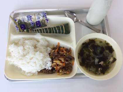 今日の給食は「こどもの日行事献立」です。ちまきは「子どもが元気で大きく育ちますように」という願いを込めて食べます。柏餅も同じような理由でよく食べられています。