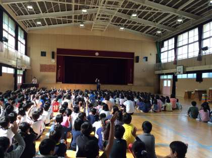 みなさん「一期一会という言葉を知っていますか?」と教頭先生が尋ねると、数名の子どもの手が挙がりました。教頭先生が若いころ、運転手さんの短期バイトをしていたときのお話です。タレントの久本雅美さんを2日間、それぞれの目的地までお連れする機会があったそうです。久本さんは運転手をしている教頭先生に、にこやかに接してくださり、短い時間でありながらも労をねぎらって、お茶をごちそうしてもらったそうです。教頭先生はとても幸せな気持ちになったそうです。