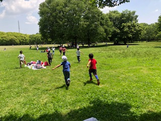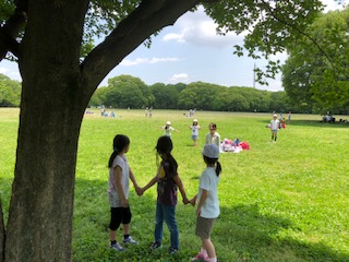 ランチのあとは、芝生広場で遊びます!木立を使って、だるまさんがころんだ!足元が雨の影響で滑りやすいため不安定でやりにくかった子どもたちでしたが、ころんでも笑って立ち上がり、ニコニコの輪がどんどんひろがりました!子どもって遊んでいる時の顔が最高ですね。