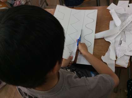 学校では、プリントを切ってノートに貼ったり、はさみがたくさん登場します。1年生ははじめてのハサミの学習を始めました。まっすぐ、ジグザグ、ぐにゃぐにゃ、四角く切るのコースを、まずはハサミの持ち方を教わり、紙を動かすのがコツなんだと教わって、上手に曲線を切ることができました。苦手な子もいますが、はじめからうまくいくわけありません。子どもたちは何度も失敗しながら、少しずつ自分のものにしていきます。そのプロセスが大切です。あきらめず、粘り強く、子どもたちとともに学んでいきます!