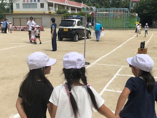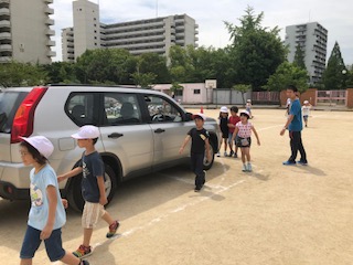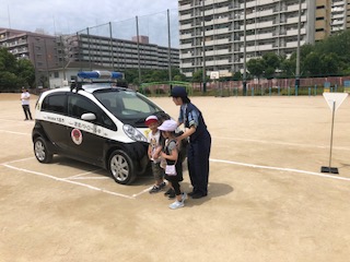 車は急に止まれない!子どもたちは住之江警察の方の話を真剣に聞きます!車の影からの飛び出し、横断するときには右左右!など、自分の命を守るために、自分が気をつけることやできることを体感しました。誰一人として命を落としてはいけません!事故や怪我から、自分の身を守るために、子どもも大人も学びます!