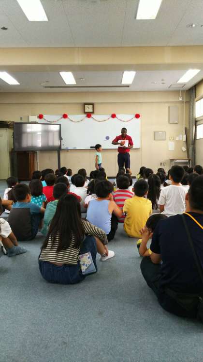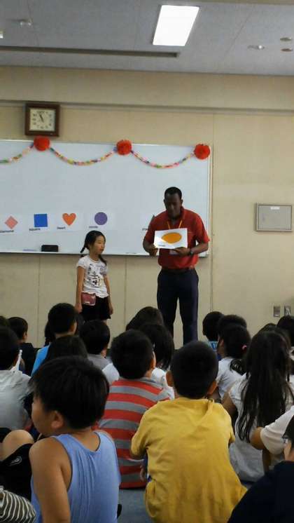 stand! sit!とジエッチャーを交えながら、ひっかけ問題にチャレンジした子どもたち!問題が出るたびに、一喜一憂を繰り返し、体で英語を感じていました!あいさつも英語で挑戦!少し恥ずかしながらも、しっかりと英語で伝え合えました!スター、トライアングル、サークルなど形を見ながら英語で表現し、目と耳と口をフルに使って、英語を楽しみました!キラキラ輝く子どもたちの目はとても素敵でした!