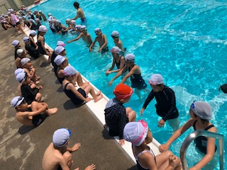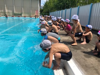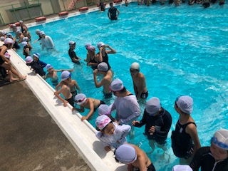 強い日差しが降りそそぐ中、校庭には1年生と6年生が集まりました!今日は1年生の水泳学習に、6年生がサポートに入ります!プールサイドで仲良くバディを組む子どもたち!先に6年生が水に入るお手本を見せます。次は1年生がゆっくりと真似をしながら入ります。先に入っている6年生が優しく声をかけながら、1年生を安心させます。「あわてなくていいよ。」「ゆっくりね。」と思いやりをもって接するリーダーの姿がそこにありました。子どもは子どもの中で育ちます!子ども同士が学び合います!そこに大人も入ります。子どもも大人もともに学び合える学校をみんなでつくりましょう!