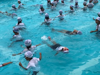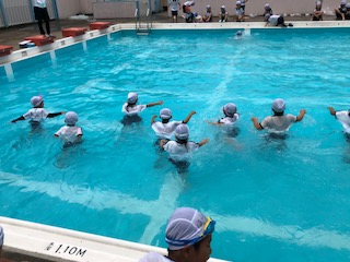 体操服を水着の上から着た子どもたち。体操服を入れてきたビニル袋が飛ばないようにサンダルを上手に重しにしています。水中を歩くこと、イルカでジャンプすることなどで服の重みを感じていました。ペットボトルやバケツなどでうきわの代用をする様子を見たり、大の字になって浮く体験をしました。もしものことは、いつ起こるかわかりません!今日の学びがもしもで生かせるやうに、日々の学びを子どもと一緒につくっていきます。