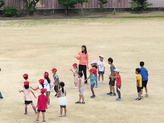 休み時間の校庭!雨が降ったりやんだりの中、1年生のドッジボールの輪の中に、6年生の姿がありました。リーダーらしく優しく1年生と遊ぶ子どもたち!カッコいいリーダーの姿は1年生のあこがれの的でした。優しくて、カッコいいってステキですね!