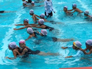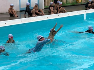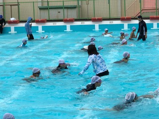小雨混じりのあいにくの空模様の中、子どもたちは今日もいろいろな動物に変身しました。まずはカワウソ!鼻の下まで水に潜って、水面を移動します。カバやクジラなどの大きな動物にもチャレンジしました。カルガモの親子では、二人一組になって上手に仲よく泳いでいました。台風通過中の不安定な空模様ですが、雷にも十分に注意しながら、水泳学習を進めたいと思います。お時間あればぜひのぞきにお越しください。お待ちしています!