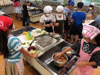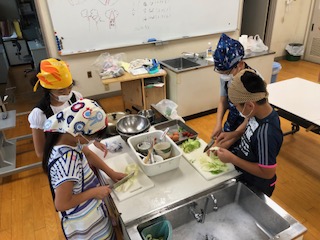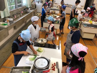 5年生がコックさんに変身!今回の調理実習はゆで野菜に挑戦!ブロッコリーとキャベツとプチトマトの野菜たちをゆでながら、卵を別のお鍋でゆでます。包丁さばきもなかなかのもの!グループで協力して、調理実習ができました!林間でも、一人一人が力を合わせて、お互いのことを、より深く知ることができればと思います!