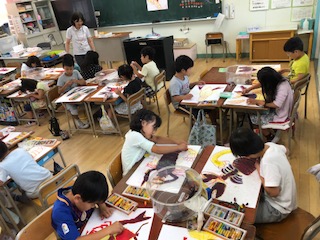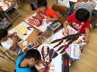 今、大切に育てているザリガニたち!2年生の子どもたちは教室前の廊下で、ザリガニの観察をしています!そして、画用紙いっぱいにザリガニを表現しています。クレパスを重ね塗りして、ザリガニの独特な色合いを見事に表現している子どもたち!みんな小さな芸術家でした!迫力満点の描写には心が惹きつけられました!子どもらしくのびやかに表現することはとても素敵ですね!