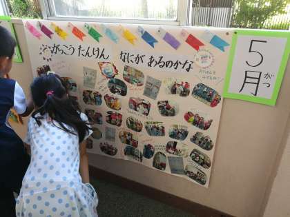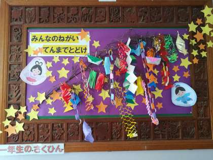 折り紙で作った七夕の飾りが、教室と廊下の「1年生の作品コーナー」に飾られています。また、1年生の教室の廊下には、「1学期の思い出」と題して、1学期を振り返る写真が掲示されています。はじめての小学校生活にドキドキ、ワクワクした1年生の子どもたちの軌跡をご覧ください。