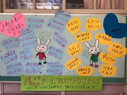 保健室前に貼られた模造紙には、「ふわふわことば」と「ちくちくことば」が掲示されています!口は災いの元と言われる通り、ほんの些細な一言で相手に嫌な思いをさせてしまいます。自分ではなんとも思っていなくても、相手にとっては心に刺さる言葉もあります。反対に、ちょっとした優しい言葉で相手を幸せな気分にさせます。そんな時、大切にすることは、「自分が言われて嫌なことは、人に言わない」です。さらに、「自分が言われてうれしいことを人に言う」です。そうすれば、みんなにとって幸せな空間ができ、みんなが安心できるんじゃないかなあ!