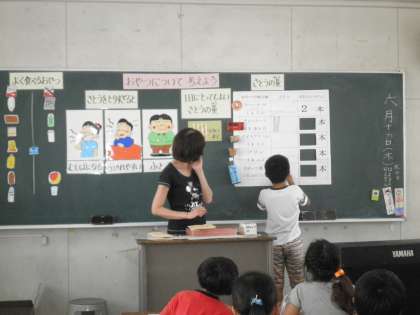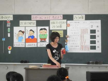 栄養教諭の山崎先生が3年生の栄養指導を行いました。今日の主題は「おやつについて」です。子どもたちにチョコレートやプリン、アイスクリーム、スポーツ飲料水に含まれる砂糖の量を予想しました。その中でも砂糖が多く含まれている食品を調べて、砂糖を取りすぎないようについて指導をしました。学んだことを生かして、子どもたちが普段のおやつの食べ方も工夫するように働きかけていきたいと思います。