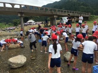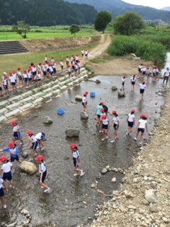 キャー、ギャー、ワー!子どもの声が響きます!川いっぱいに広がって、魚との対決が始まりました!
