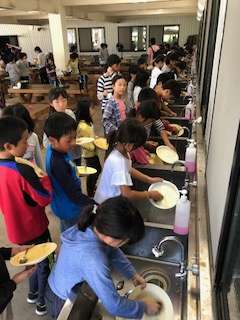 楽しい食事のあとは、かたづけです!カレーを煮込んだお鍋がくせもの!グループでどれだけ力を合わせてできるかが鍵です!自分で考え、自分から行動し、自分も人も大切にできるかが鍵です!突然の来客(トカゲ?)もみんなを応援しています!