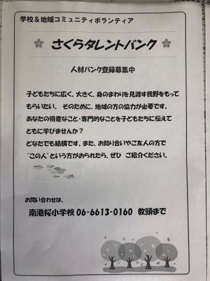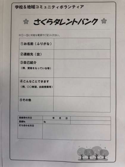 さて、この度「さくらタレントバンク」を開設することとなりました!子どもたちに広く、大きく、身の回りを見渡す視野を持ってもらいたい。そのために、地域のみなさんの得意なことや専門的なことを子どもたちとともに学びませんか?楽しく学ぶ大人の姿が子どもたちの学ぶ意欲につながります!