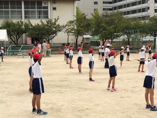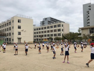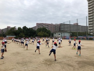 「イーヤーサーサー!」のかけ声が運動場に響いています!子どもたちは、優雅な曲に合わせて、エイサーを表現しています!隊形移動の時にも、その優雅さと壮大さを体から感じ取ることのできる動きを極めていきます!乞うご期待!