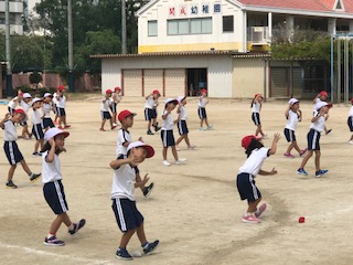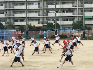 子どもたちの活動場所が運動場になり、運動会当日の動きを学ぶようになってきました。子どもたちは大きくひろがったり、小さくまとまったり、音楽に合わせて体の動きで表現します。ダンスもこれまでの積み重ねた力を十分に発揮しています!笑顔のすてきな1年生でした!
