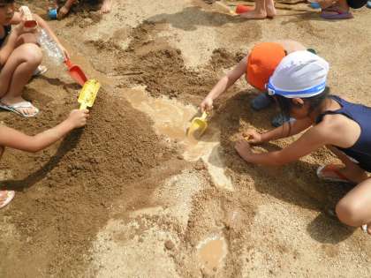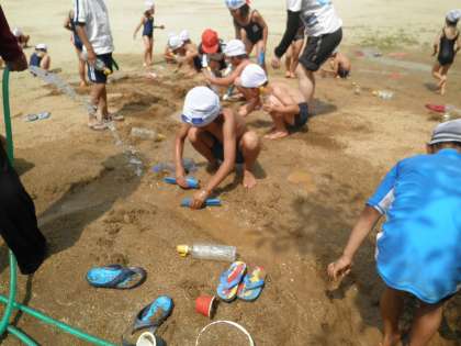 7月2日に、1年生の子どもたちは、生活科と図工科を合わせて「どろんこあそび」をしました。「川をつくろう」「山もできるよ」とわいわい楽しみながら取り組みました。どろんこ遊びが終わってから、シャワーを浴びてとても気持ちがよさそうでした。