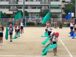 いよいよ残すところあと1週間!午後からは晴れ間も見られて絶好の天気となりました。子どもたちの表現活動もキレを増して、見ていて気持ちのいい動きのまとまりを見せてきました。旗が振られたときに出る旗音が空気をつんざき、リズム感に凄みを与えます!青黄緑の旗が縦横無尽に動く様子はやはり圧巻です!あとは気持ちを自分でどうコントロールするかでしょう!自分で考えて、自分から動く!これです!