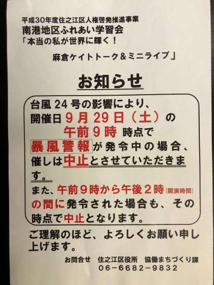 平成30年9月28日(金)台風接近にともなうお知らせ