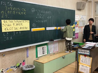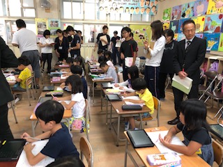 チャイムとともに子どもたちの頑張る気持ちも高まりました!研究授業ということでたくさんの大人に囲まれて子どもたちも少し緊張気味でした!そんな中でも子どもたちは「ハイ!ハイ!」と元気よく手を挙げて、自分の考えを伝え合いました!タブレットを効果的に使うにはどうしたらいいのか?今年の研究のテーマのひとつです!子どもたちは巧みなタブレット操作で、自分の考えを確かめたり、違う考えを確認しあったりしていました。学びの楽しさをこれからも追求していきます!
