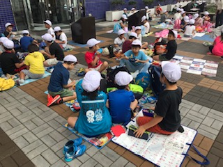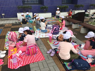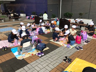 雨雲らしき空の気配の中、少し早めのお弁当タイム!海遊館の建物を背にして、思い思いにシートを広げて、ランチを楽しみました!