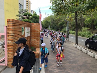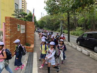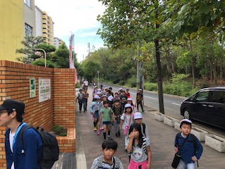 長く楽しい遠足から、無事に帰ってきました!子どもたちの、顔は満足感でいっぱいです!帰りでも元気なハイタッチでした!