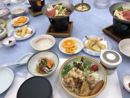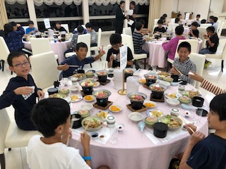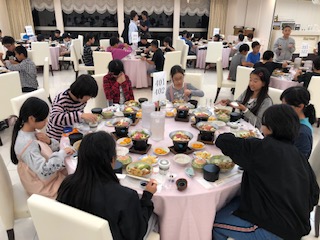 午後6時。夕食です!結婚式場で使用する会場で円卓を囲んでみんなで楽しくディナーです!なかなかのボリュームあるメニューに子どもたちはビックリ!「お昼の、バイキング食べ過ぎたから無理!」と言いながらも、いざ「いただきます」となるとモグモグスタート!あれよあれよとテーブルの料理がなくなっていきます。食欲旺盛な子どもたちです!