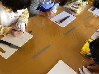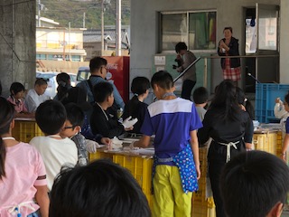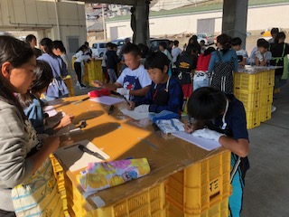 漁港のお母さんから指示が出ます!一瞬に集中する子どもたち!まずはタグに自分の印を書き込みます!