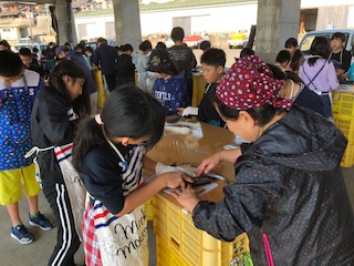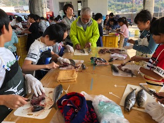 そして、最後は開きます!背開きで思い切って包丁を動かします!内臓をきれいに出せば出来上がり!漁港のみなさんが上手に子どもたちに方法を伝えてくれます!子どもたちも素直に聞いてチャレンジしています!なんとなく、なかなかの腕前に見えてきました!さすが子どもは飲み込みが早い!