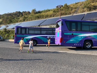 ただいま紀ノ川SAです!予定より10分ほど遅れていますが、ほぼ順調に走行しています!子どもたちも車内でDVD上映中でおとなしいです!眠りについている子どももちらほら!あと60分後には学校です!
