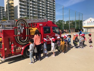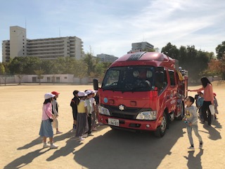 消火器訓練を見学した1年生は、運動場に停めてある消防車の見学です!大きな赤い車を前にして、子どもたちは驚きと嬉しさとでニコニコ顔でした!
