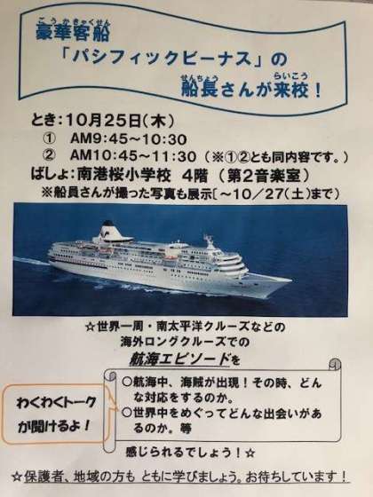 突然のことですいません!でもビックチャンスです!今、日本に停泊中の豪華客船である「パシフィックビーナス号」の船長(キャプテン)がわずかな時間の隙間をぬって、桜の子どもたちにメッセージを届けに来てくれます!本当に急なこともあり、時間限定ということもあり、体験可能なクラスが学びに行くことになりました。ぜひ、保護者や地域のみなさまも参加いただき、ともに学びましょう!たくさんのみなさまの来校をお待ちしています!